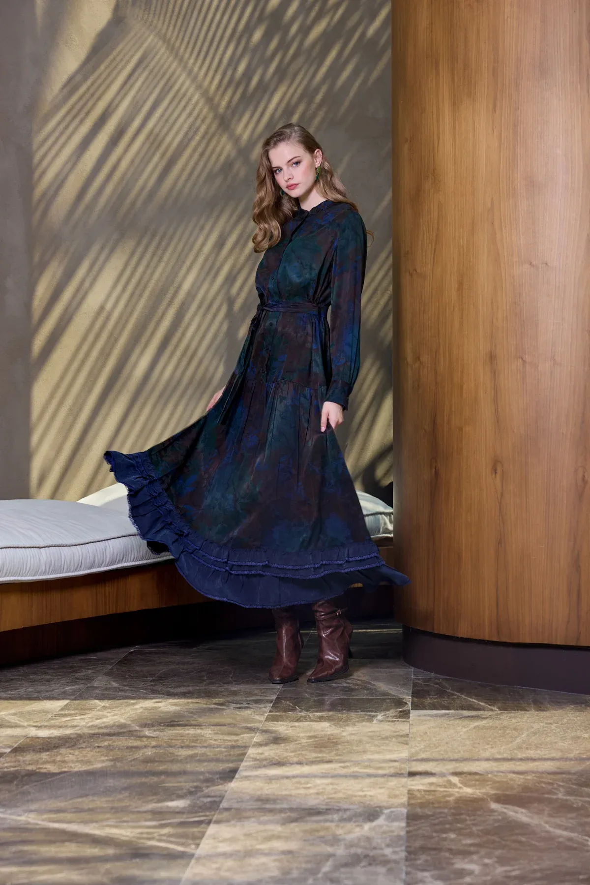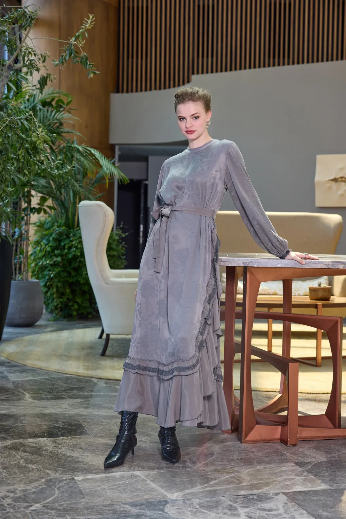 Nuss kemer ve citcit detayli ipek elbise 2002 kahve