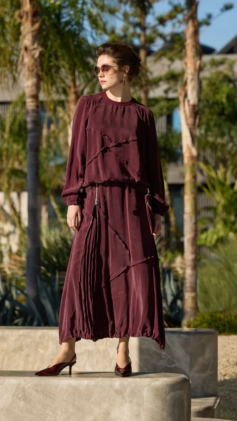 NUSS CUPRA İPEK ELBİSE 2026 BORDO