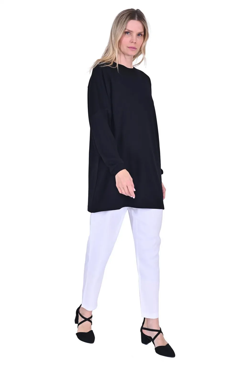İpek dokunuşlu triko kumaştan üretilen tunik, dökümlü kesimiyle zarif bir siluet sunar. Kayık yaka ve geniş kolları, hem şıklığı hem de rahatlığı bir arada yaşatır. İnce dokusu sayesinde mevsim geçişlerinde ideal konfor sağlar ve günlük şıklığa modern bir dokunuş katar.