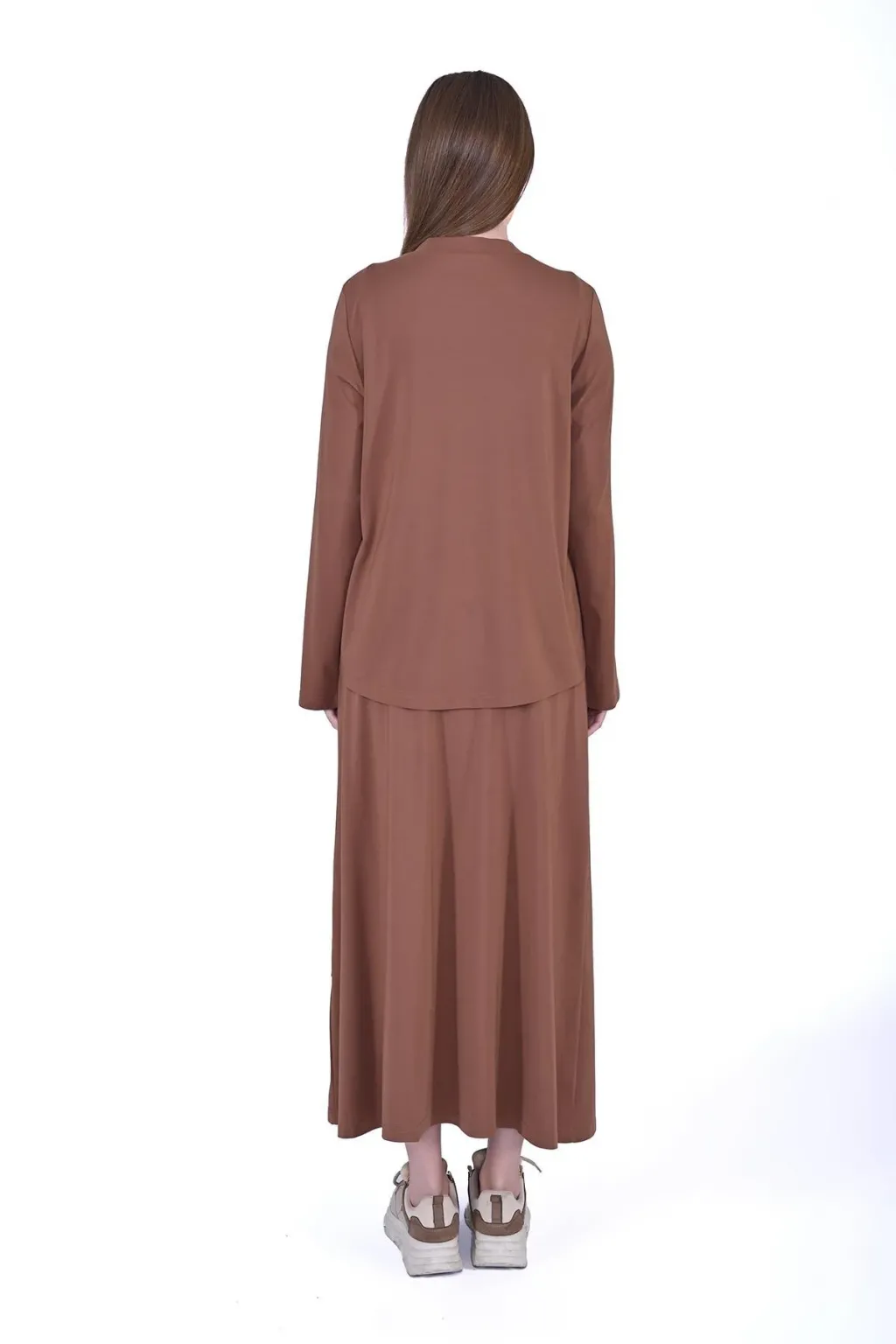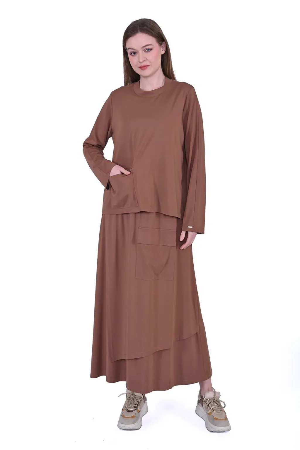 Günlük kombinlere ince bir şıklık katan bu takım, modern kesimli tunik ve akıcı etek uyumuyla dikkat çekiyor. Tuniğin asimetrik hattı ve gizli cepleri, işlevselliği estetik detaylarla harmanlarken kullanım kolaylığı sunuyor. Eteğin dökümlü formu, her adımda özgürce hareket etmenizi garantiler ve uzun süreli konfor sağlar.