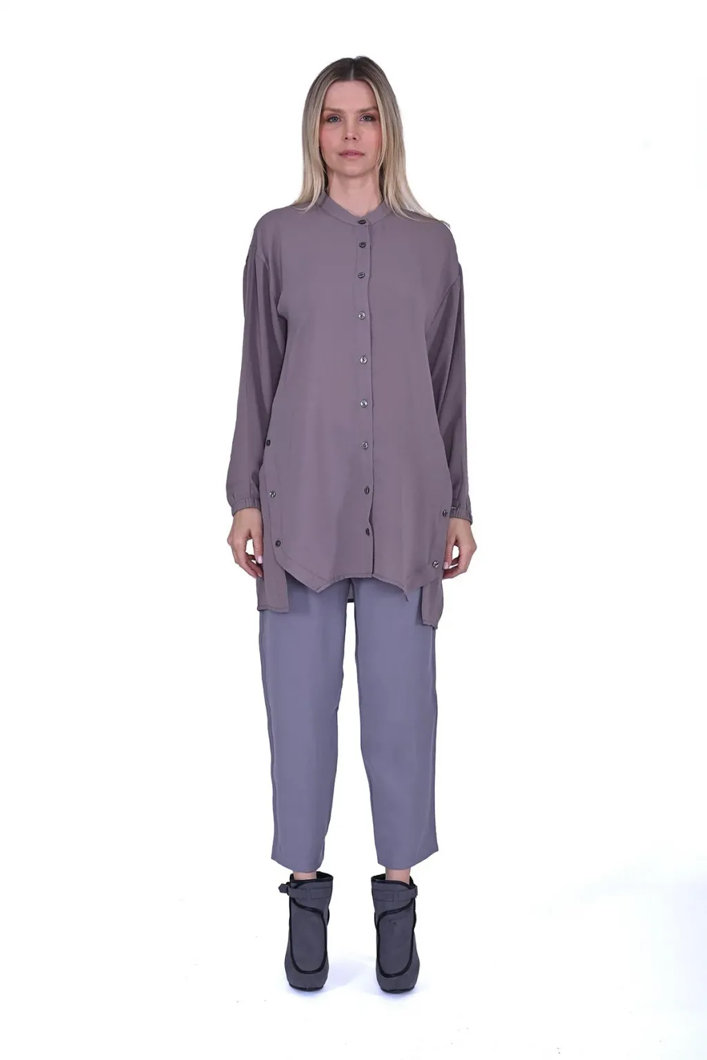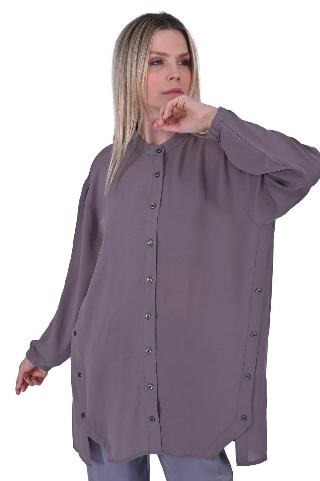 Yumuşak dokulu kumaştan üretilen bu gömlek; asimetrik kesimi ve kenar düğme detaylarıyla fark yaratır. Önden düğmeli kapamaya sahip model, dikkat çekici tasarım çizgisiyle günlük şıklığa hafif bir hareket katar. Salaş kesimi sayesinde vücuda rahatça oturur ve katmanlı kombinlere kolaylıkla uyum sağlar.
