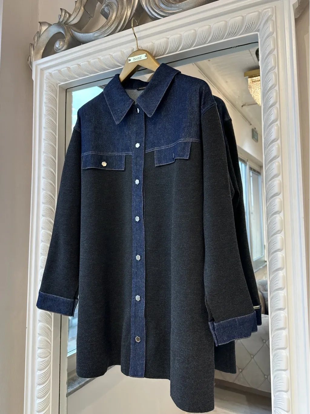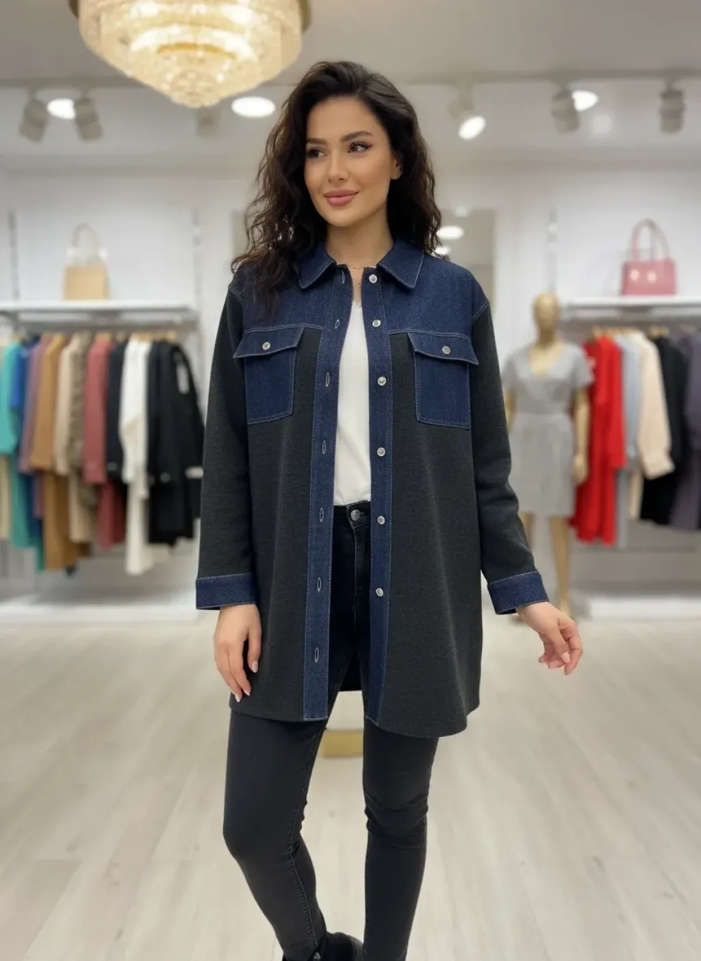 Modern tasarımı ve rahat kalıbıyla öne çıkan denim detaylı gömlek ceket, günlük şıklığı konforla buluşturur. Üst bölümde kullanılan denim kumaş detayı modele dinamik bir görünüm kazandırırken, gövde ve kol kısmındaki triko kumaş gün boyu rahat bir kullanım sağlar.