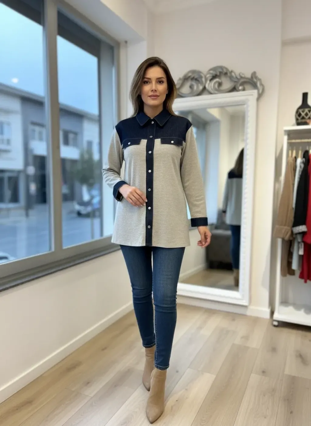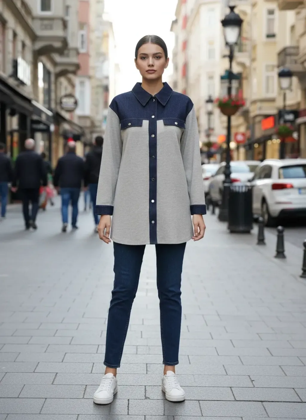 Modern tasarımı ve rahat kalıbıyla öne çıkan denim detaylı gömlek ceket, günlük şıklığı konforla buluşturur. Üst bölümde kullanılan denim kumaş detayı modele dinamik bir görünüm kazandırırken, gövde ve kol kısmındaki triko kumaş gün boyu rahat bir kullanım sağlar.