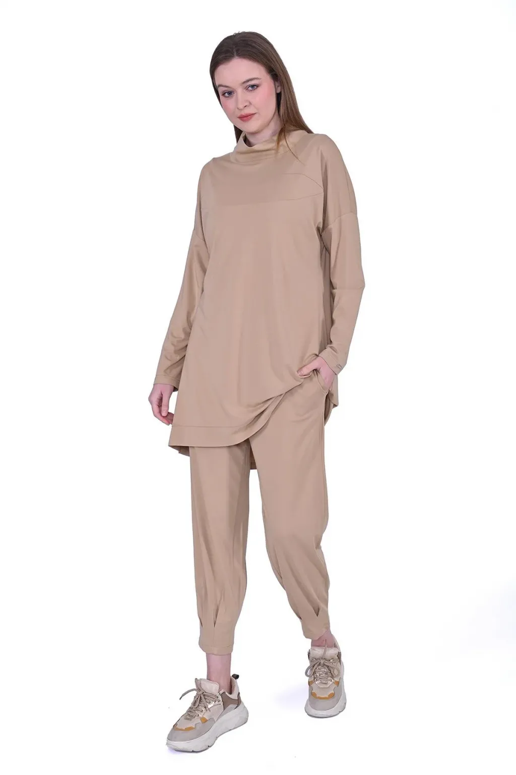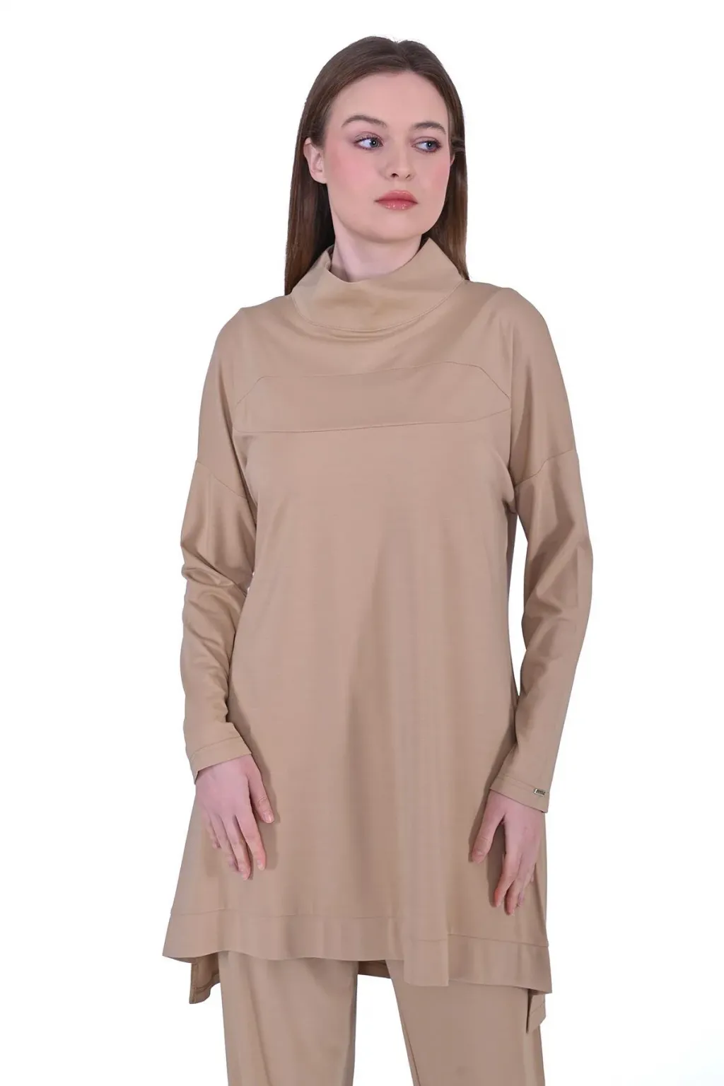 Dökümlü kesimiyle ferah bir duruş sunan bu tunik, yüksek yakası ve asimetrik etek ucu detaylarıyla modern bir hava katıyor.Paçası pileli altı ile rahat bir kullanım sağlıyor. İnce kumaşı, hafifliği ve zarafeti bir arada yaşatıyor. Günlük veya özel kombinlerin vazgeçilmezi olacak çok yönlü bir tercih sunuyor.