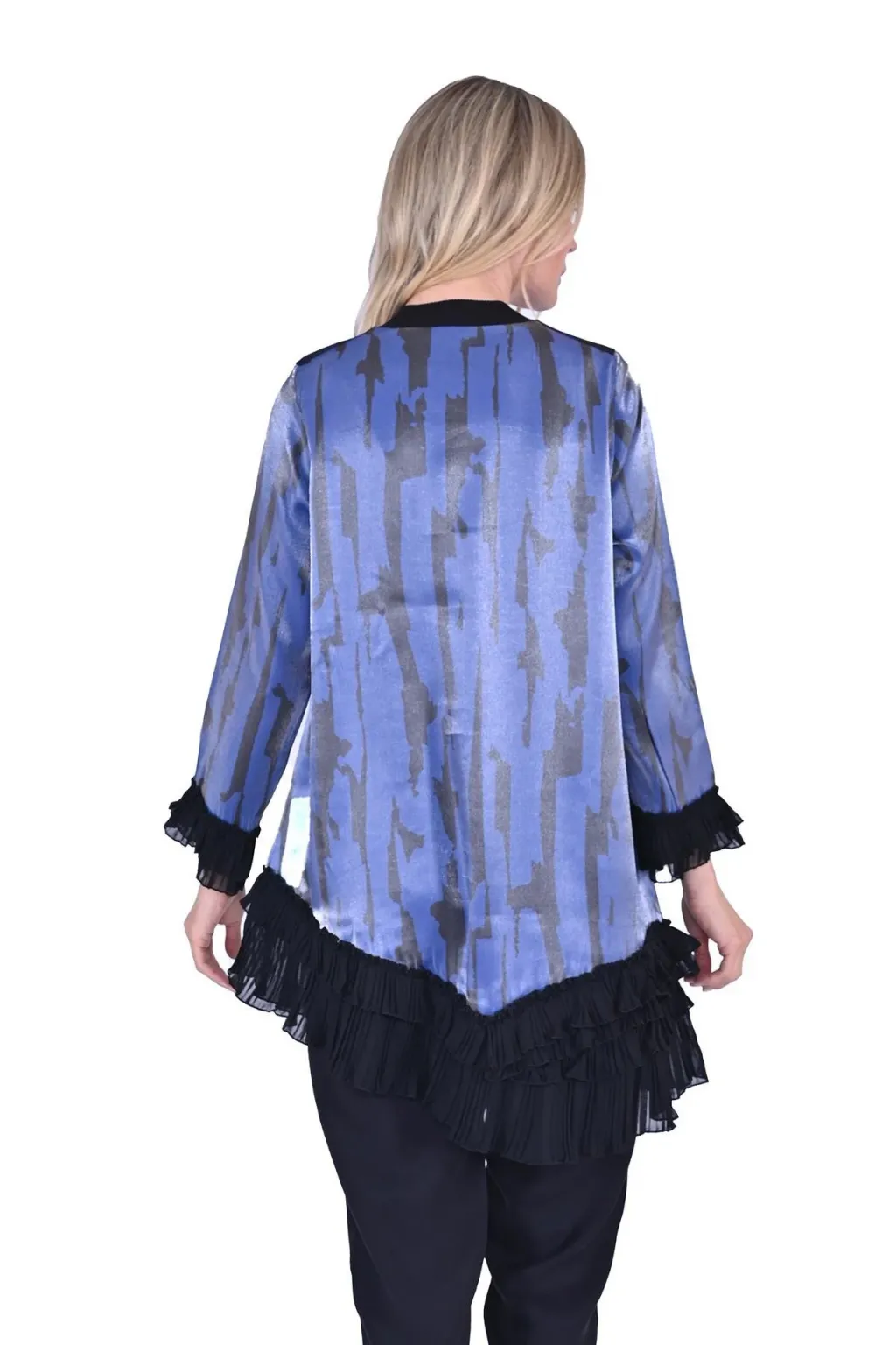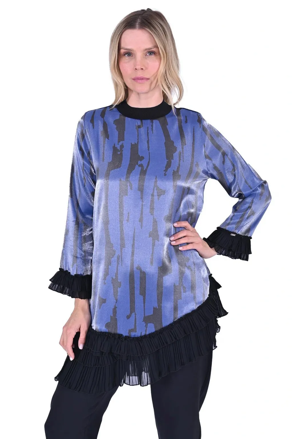 Silk görünümlü dokusuyla zarif bir duruş yaratan tunik; geniş kalıbı ve uzun kol yapısıyla konforu ön planda tutar. Asimetrik kesim alt kısmı ve kol ve etek ucu plise detayları, hareket katarken modern bir hava kazandırır.