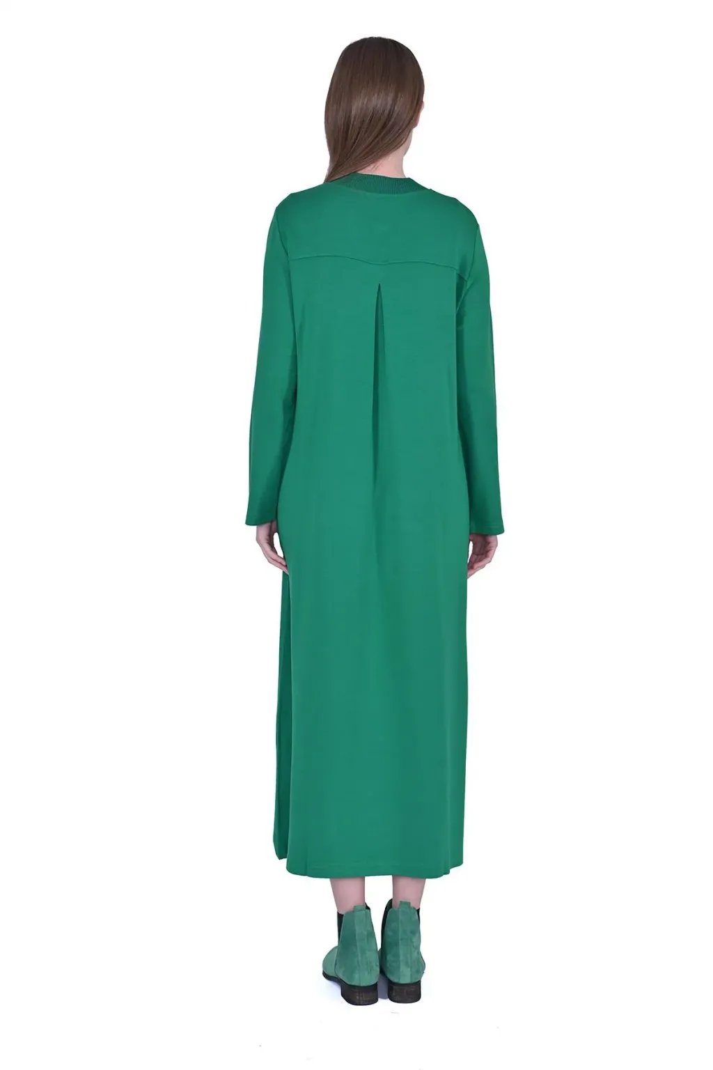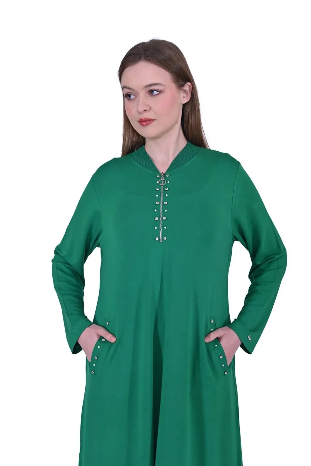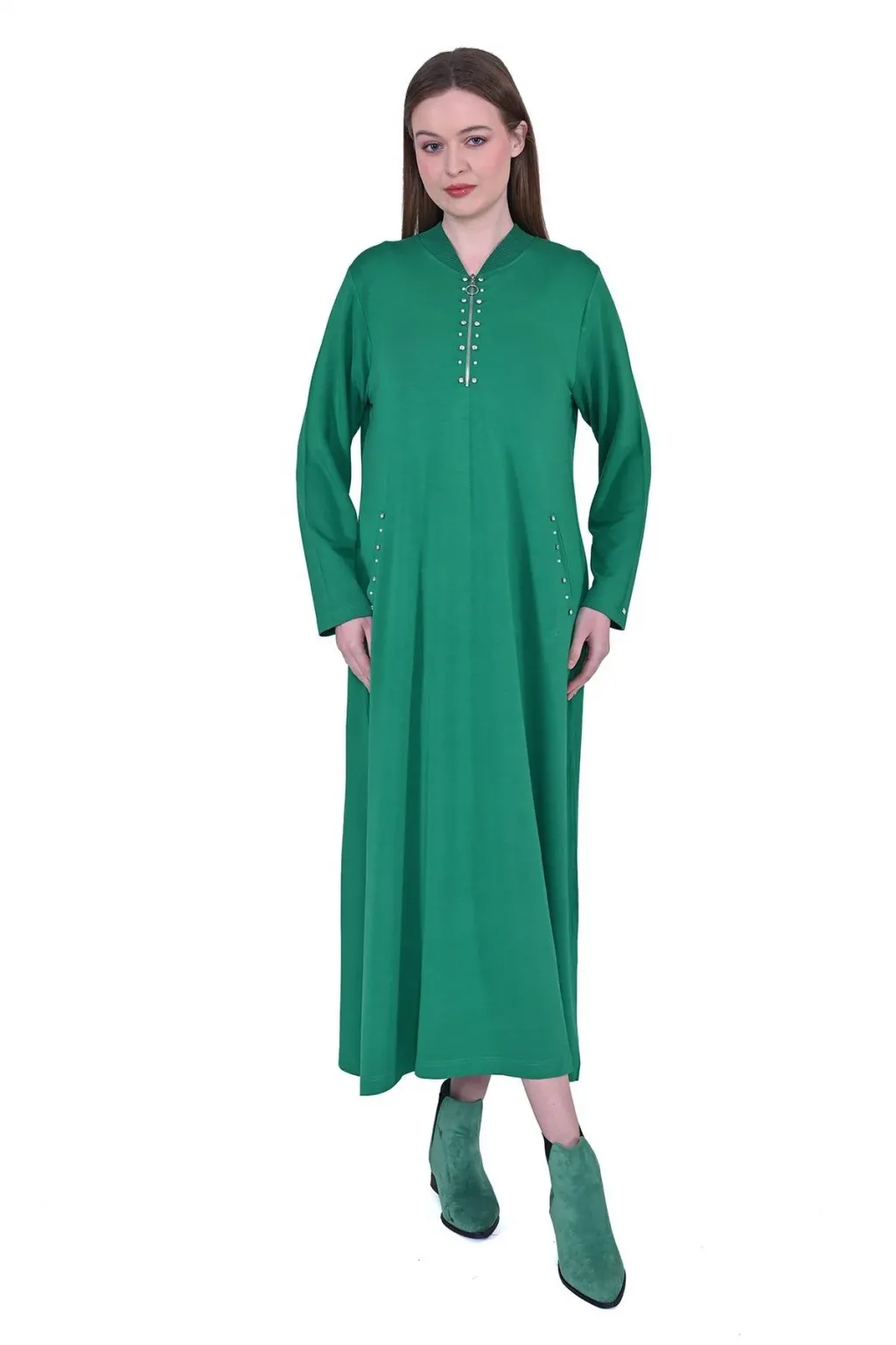 Canlılığıyla öne çıkan, A kesim dökümlü bu maxi elbise, yumuşak ve hafif jersey kumaştan üretilmiştir. Yuvarlak yakası ve uzun kolları gün boyu ferahlık sağlarken; göğüs ve yan cep bölümlerindeki parlak metal taş süslemeleri modern bir ışıltı katıyor. Bel hattında başlayan hafif genişleme, yürüyüş esnasında zarif bir hareket sunar.