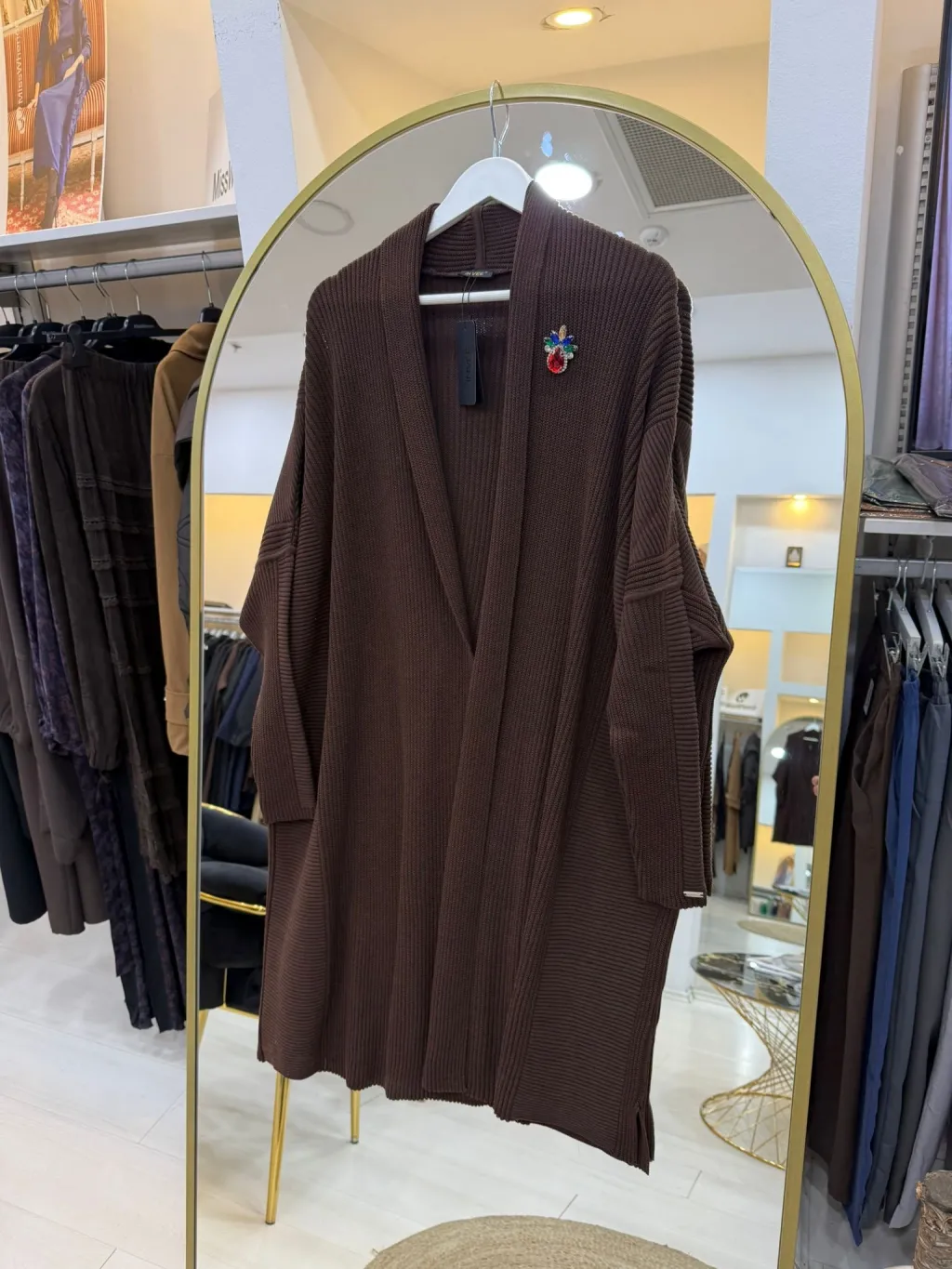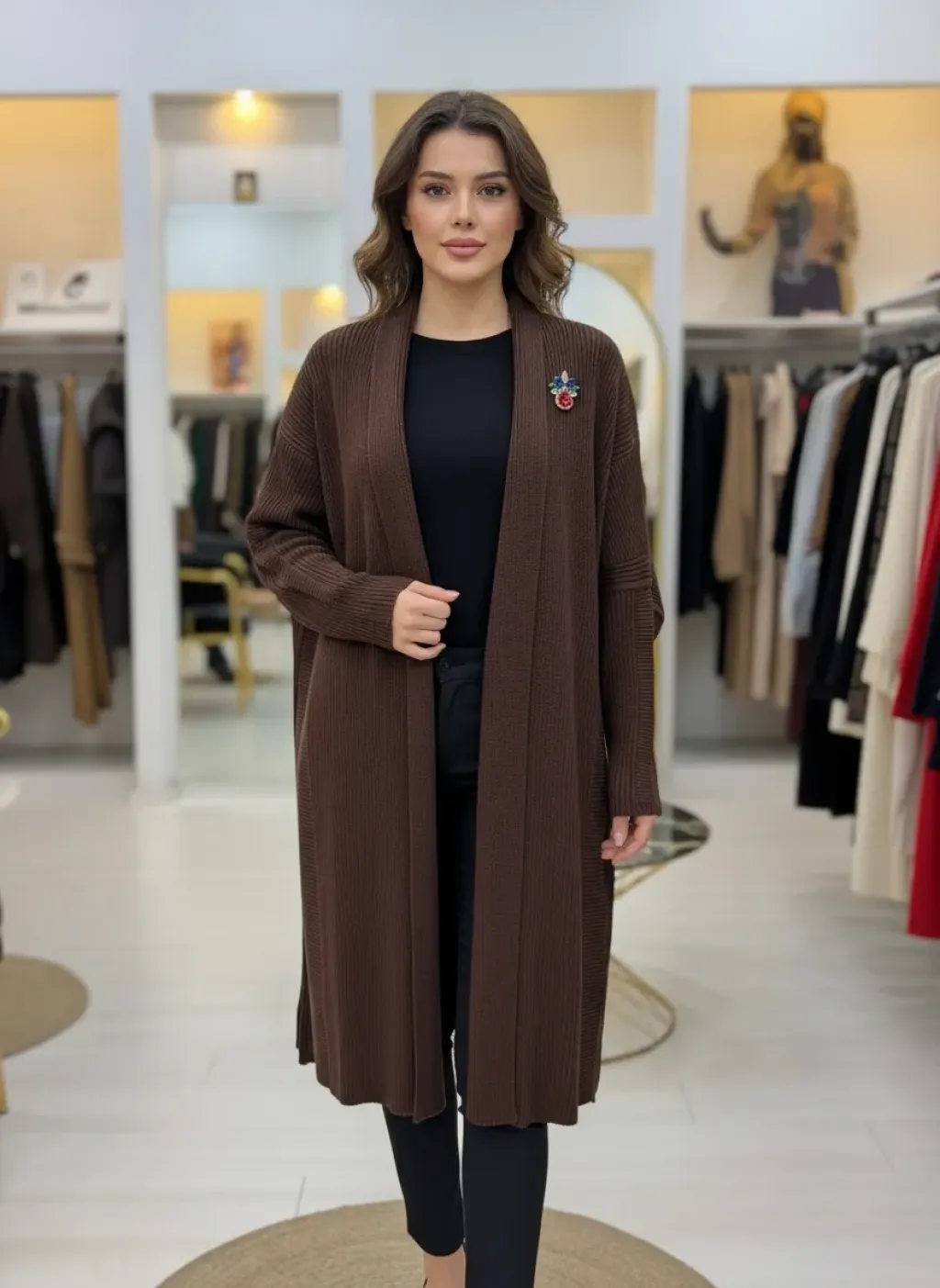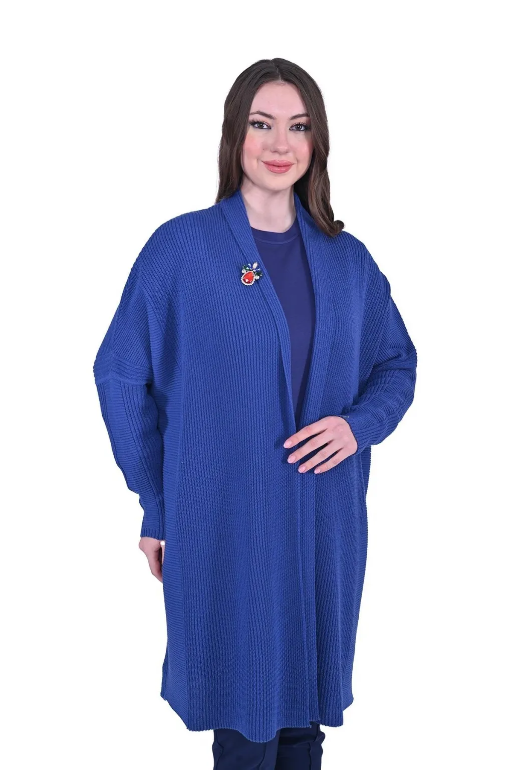 Hafif kabarık örgüsü zarif bir hacim sunarken salaş formu gün boyu konfor sağlar. Dökümlü şal yakası boynu nazikçe sarar ve ince manşetler hareketlerinize ritmik bir vurgu katar. Açık kullanımı, her kombininizi öne çıkaracak şekilde tasarlanmıştır.