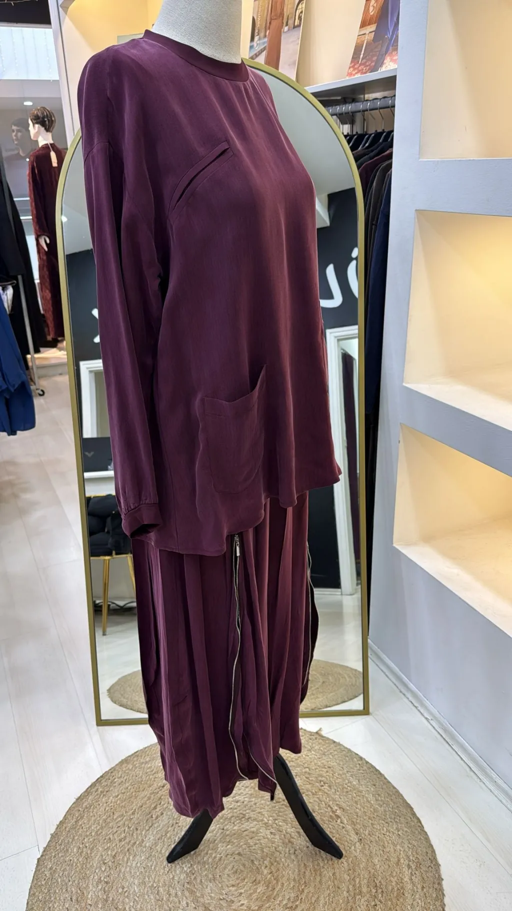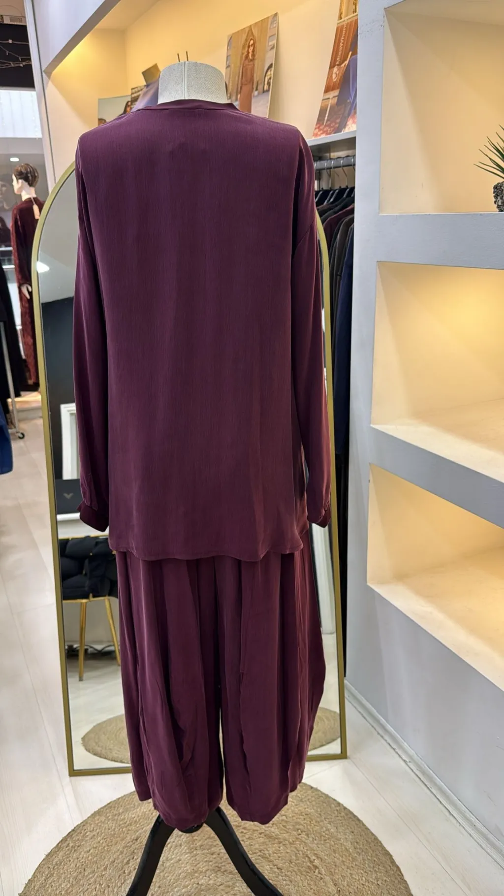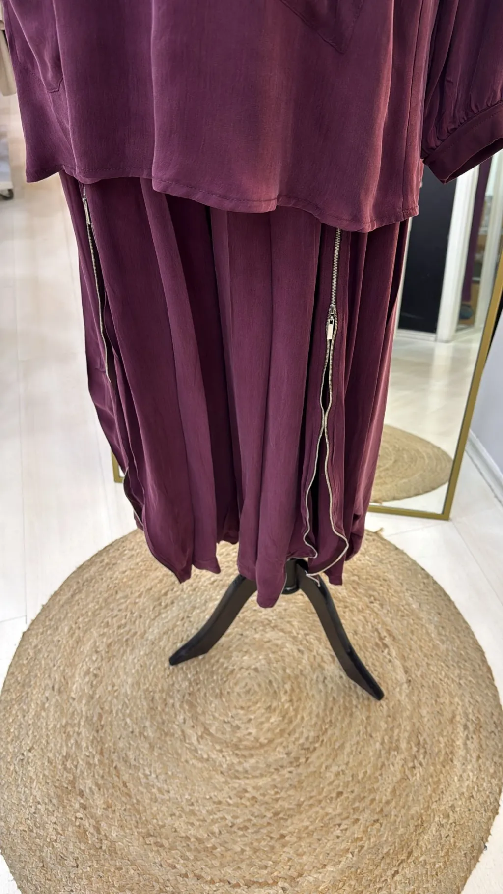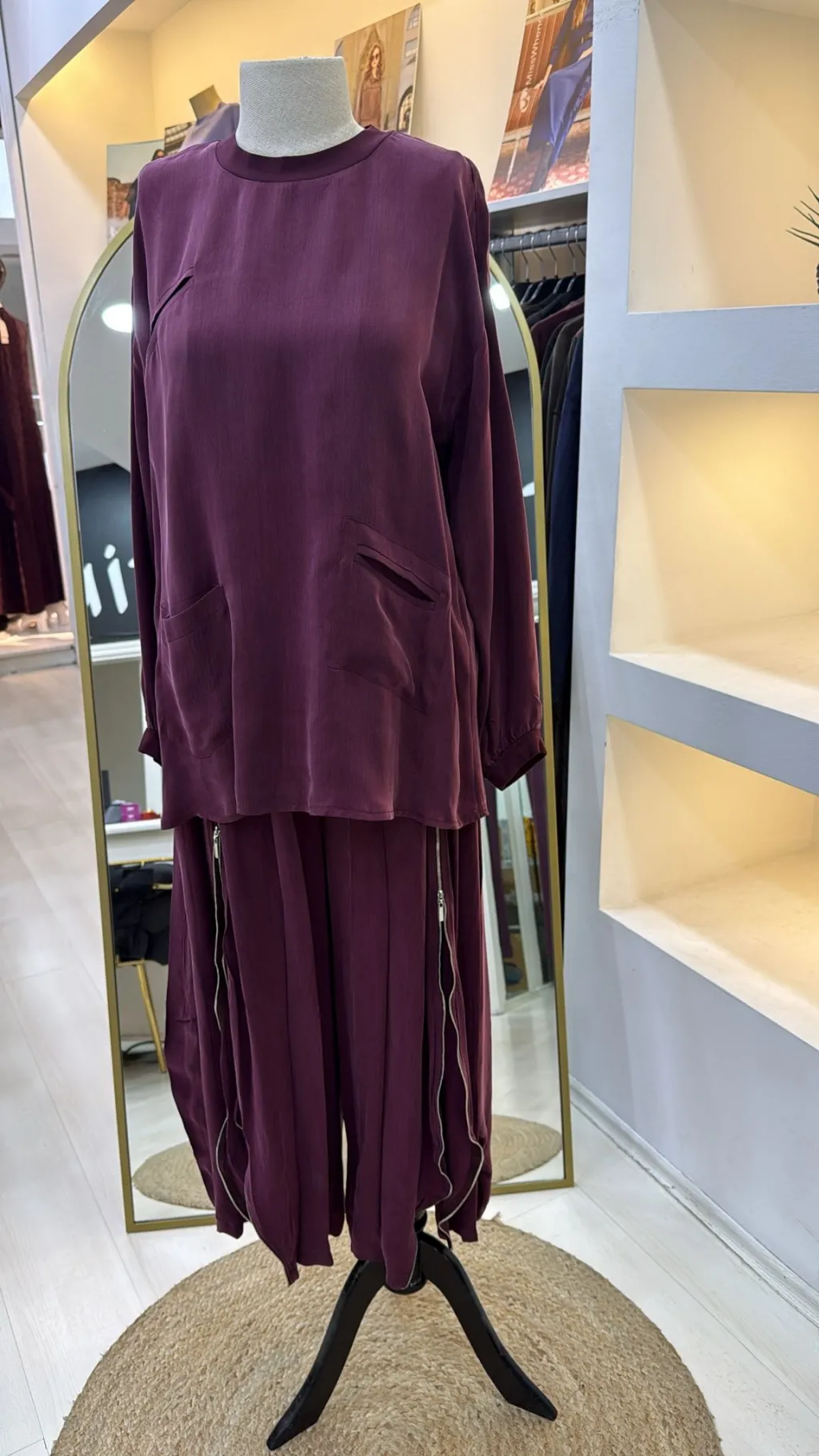 ÜRÜN FERMUAR DETAYLI KUPRA İPEK TUNİK ŞALVARLI PANTOLON TAKIMDIR
