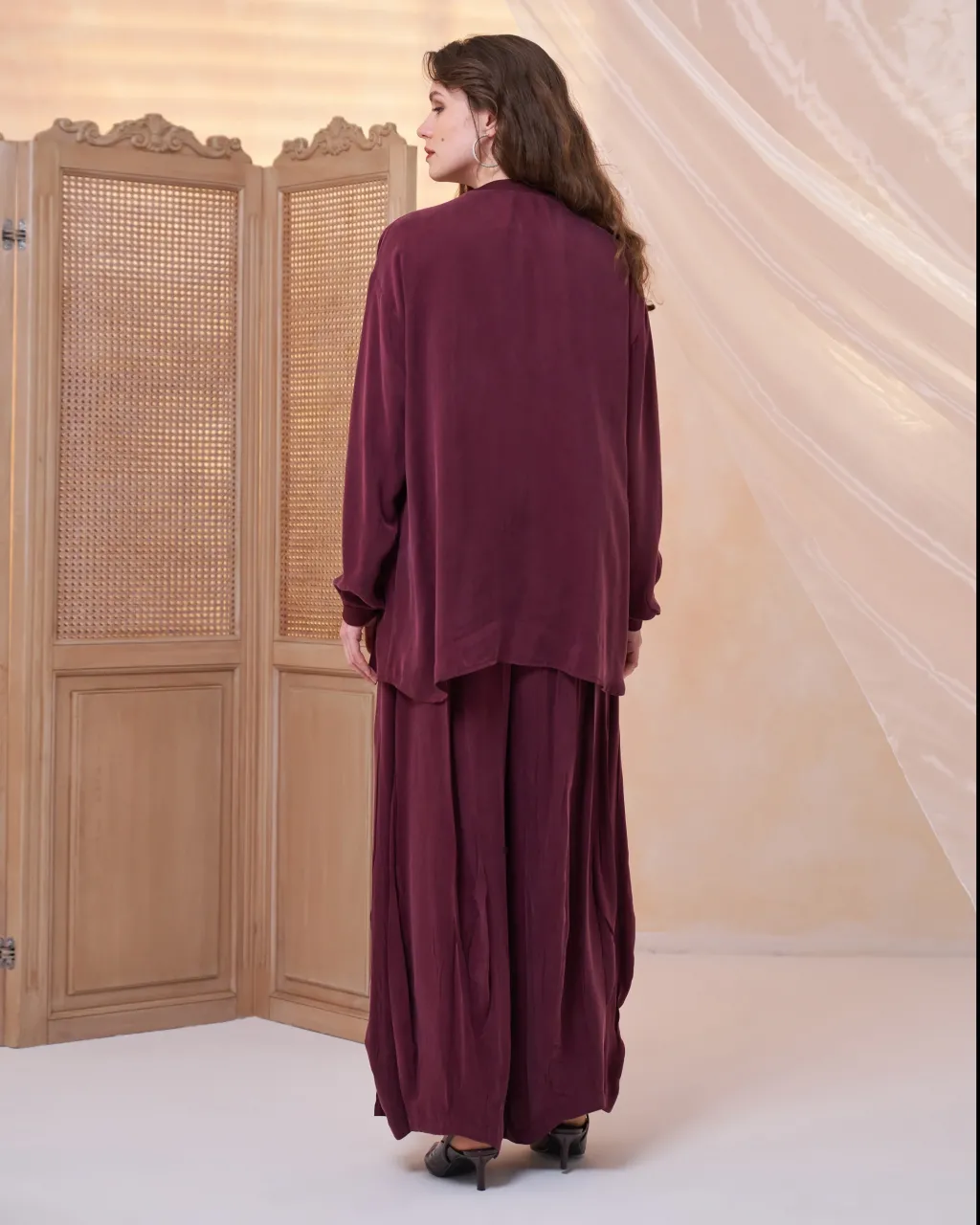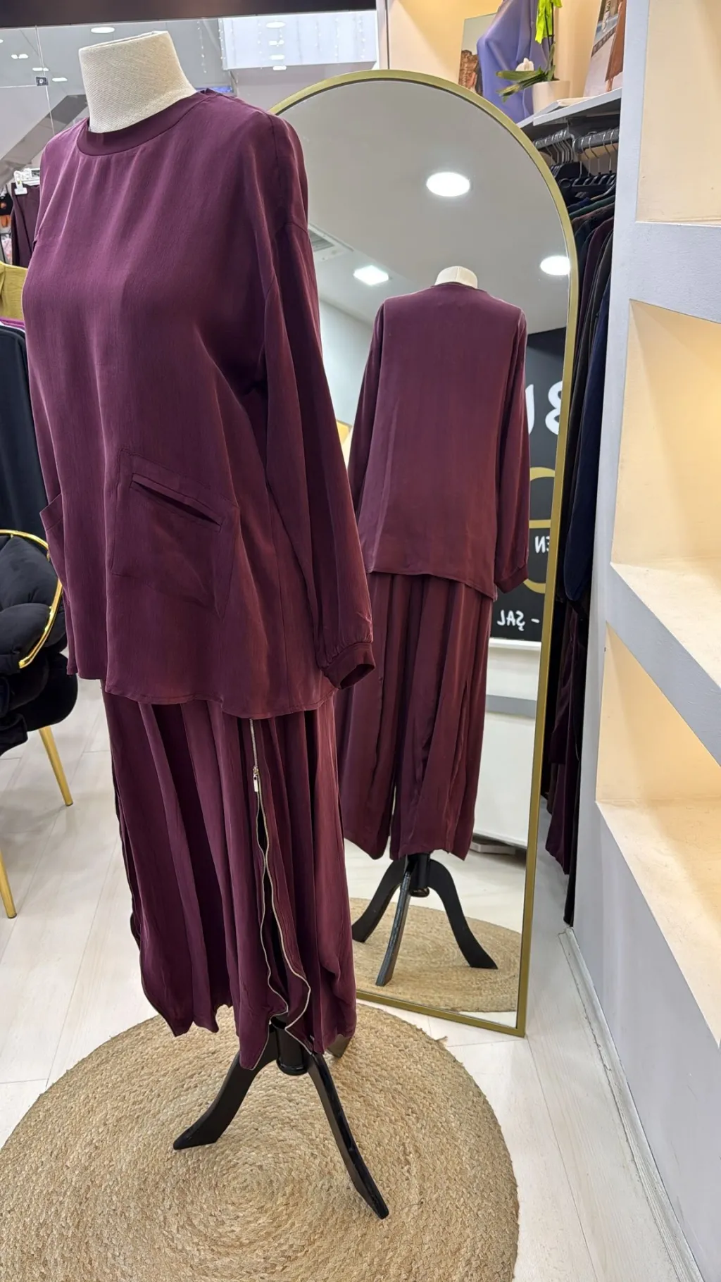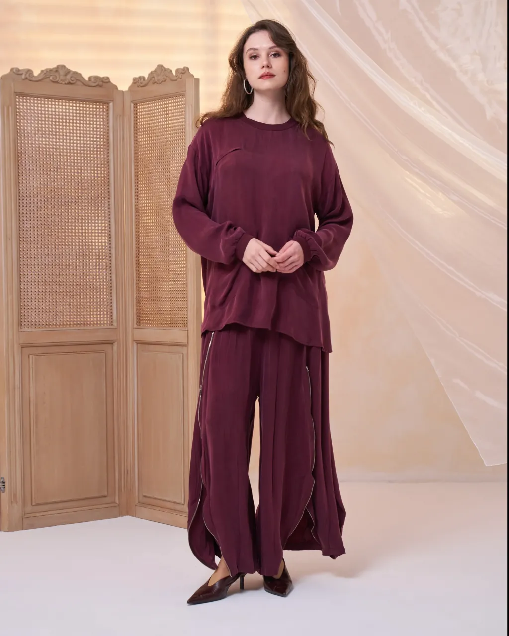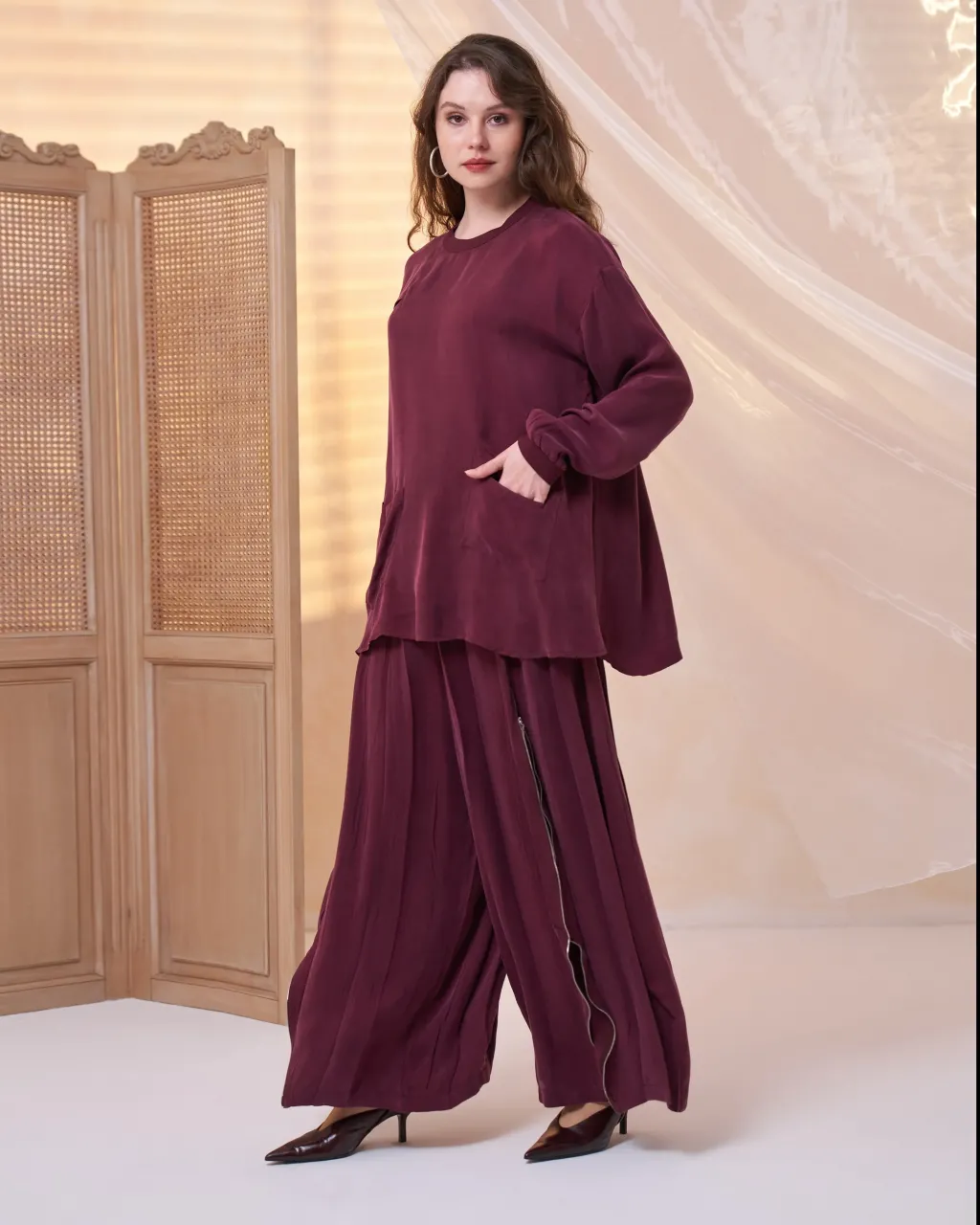 ÜRÜN FERMUAR DETAYLI KUPRA İPEK TUNİK ŞALVARLI PANTOLON TAKIMDIR
