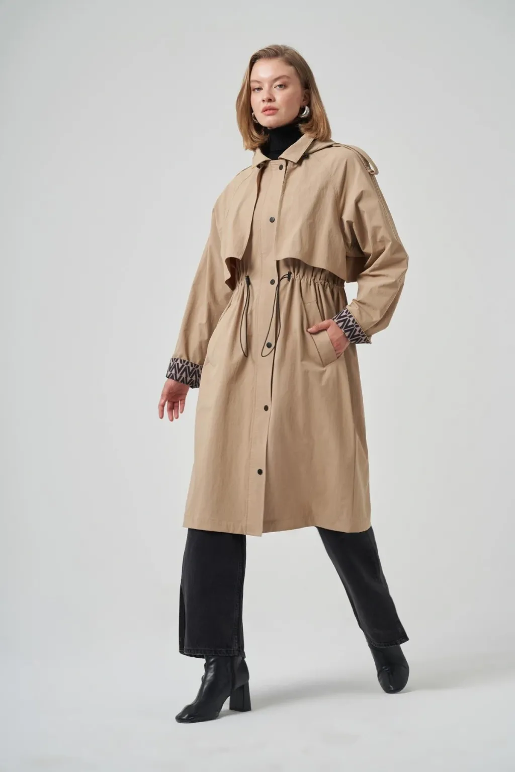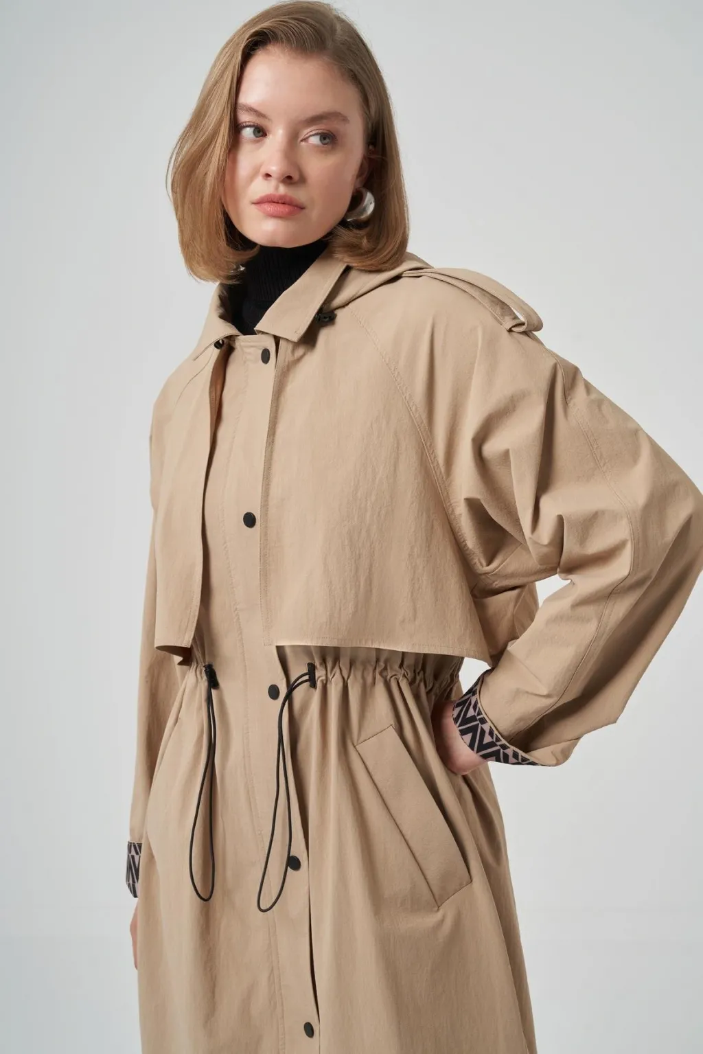 Nuss 6033 Kapişon ve Kol Yazı Detay Trenç - Camel