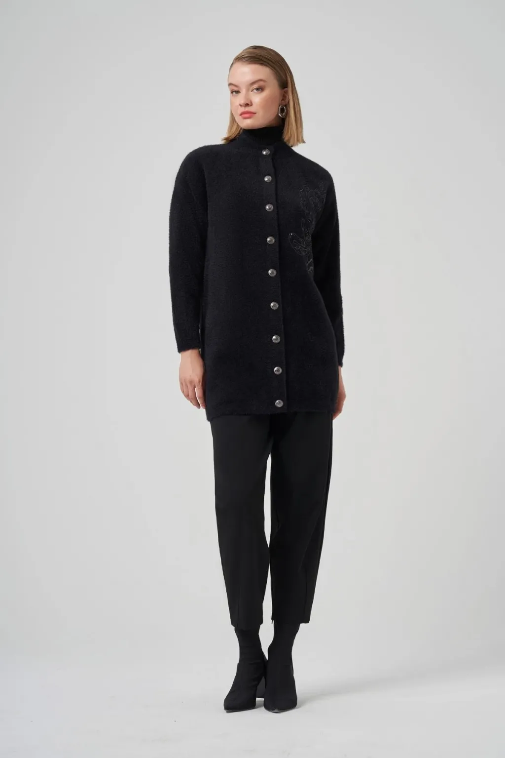 Nuss 7007 Yan Nakış İşlemeli Hırka - Siyah