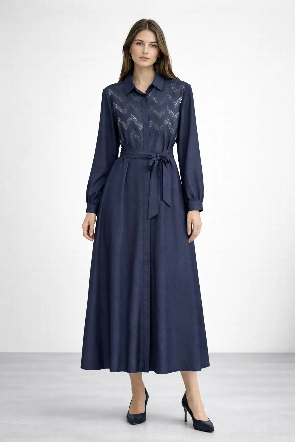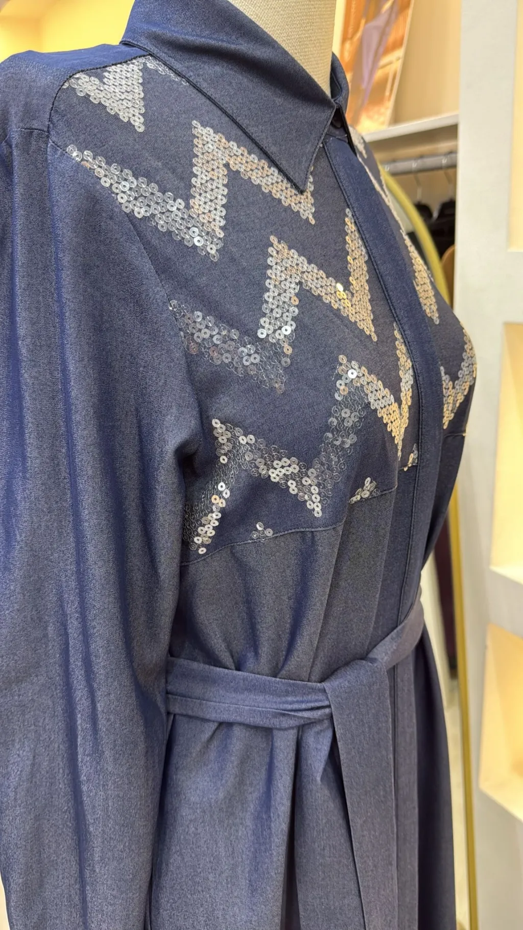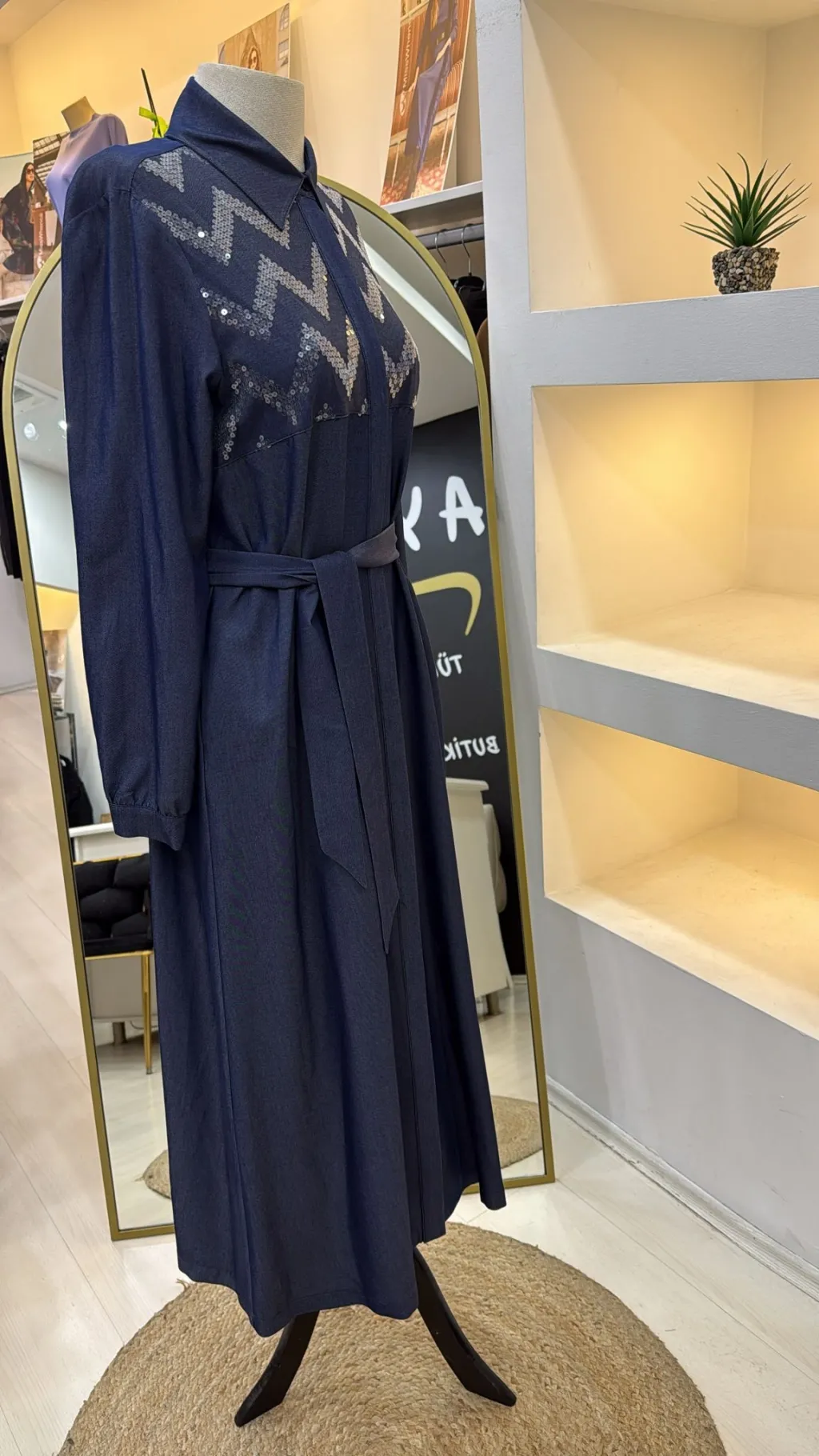 Nuss Payet Detay Kemerli Elbise - Denim 2034