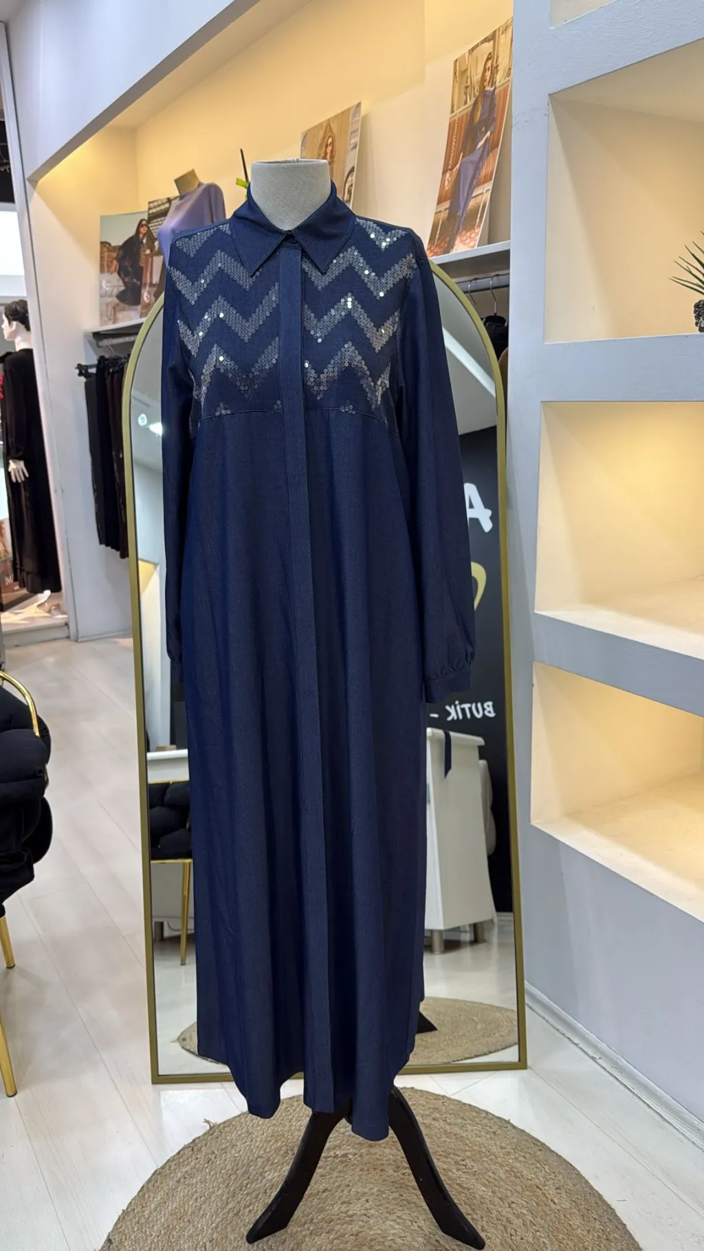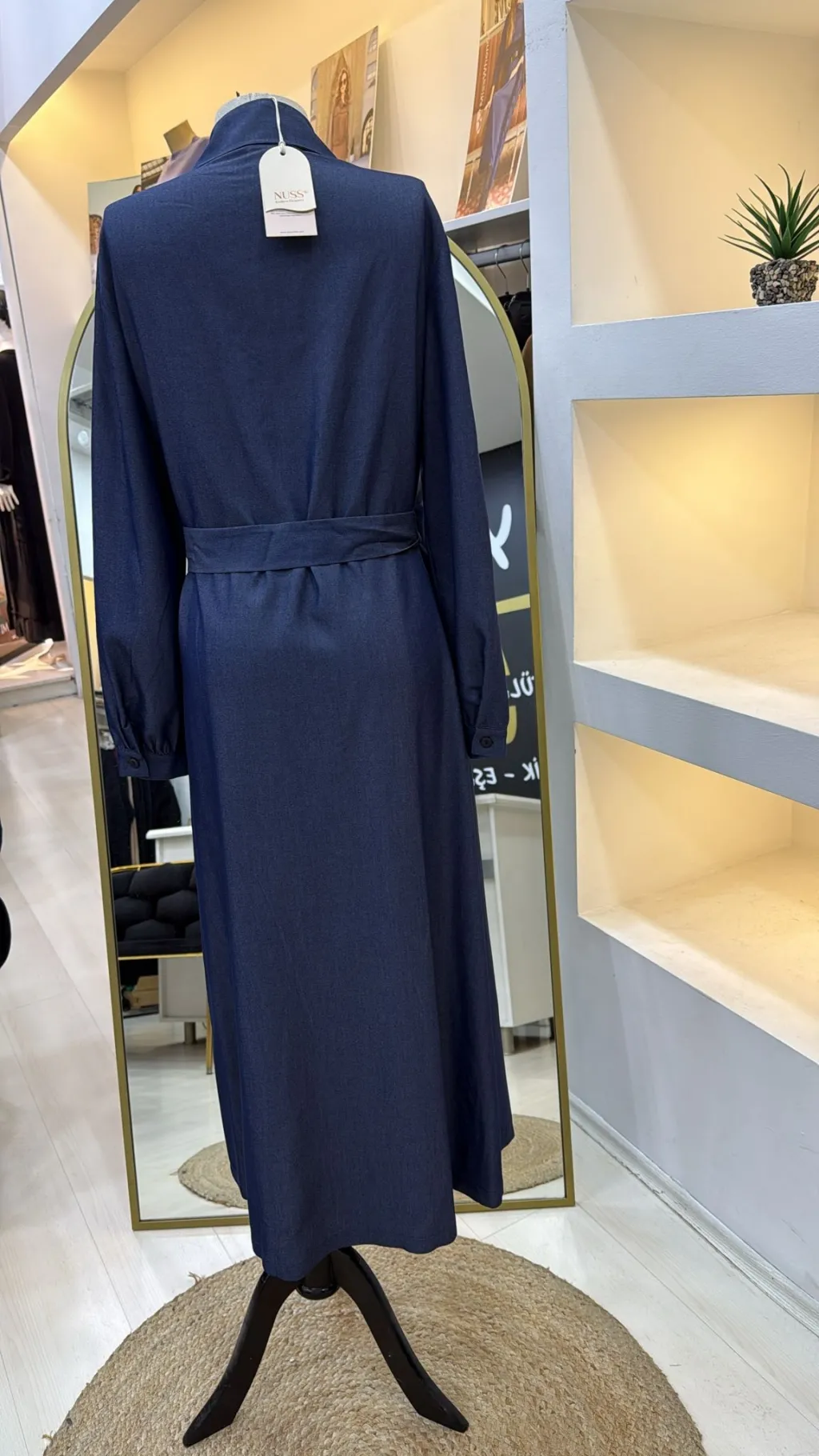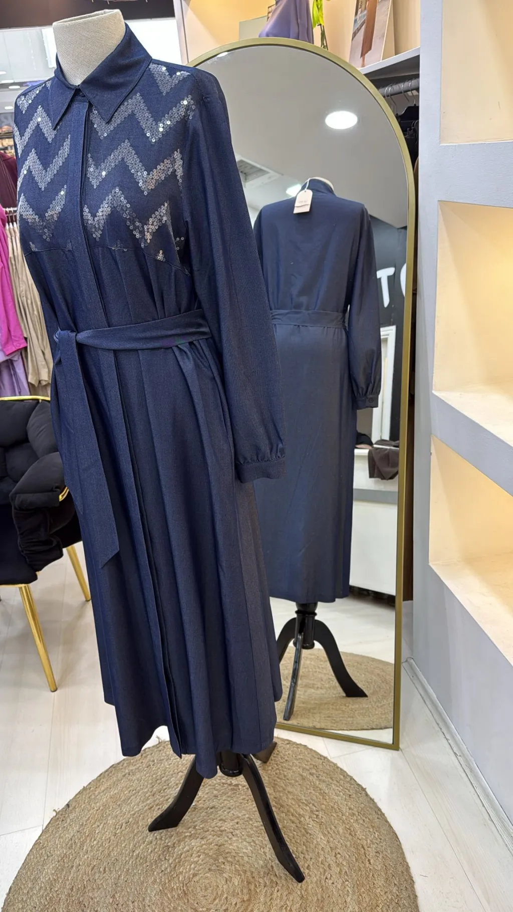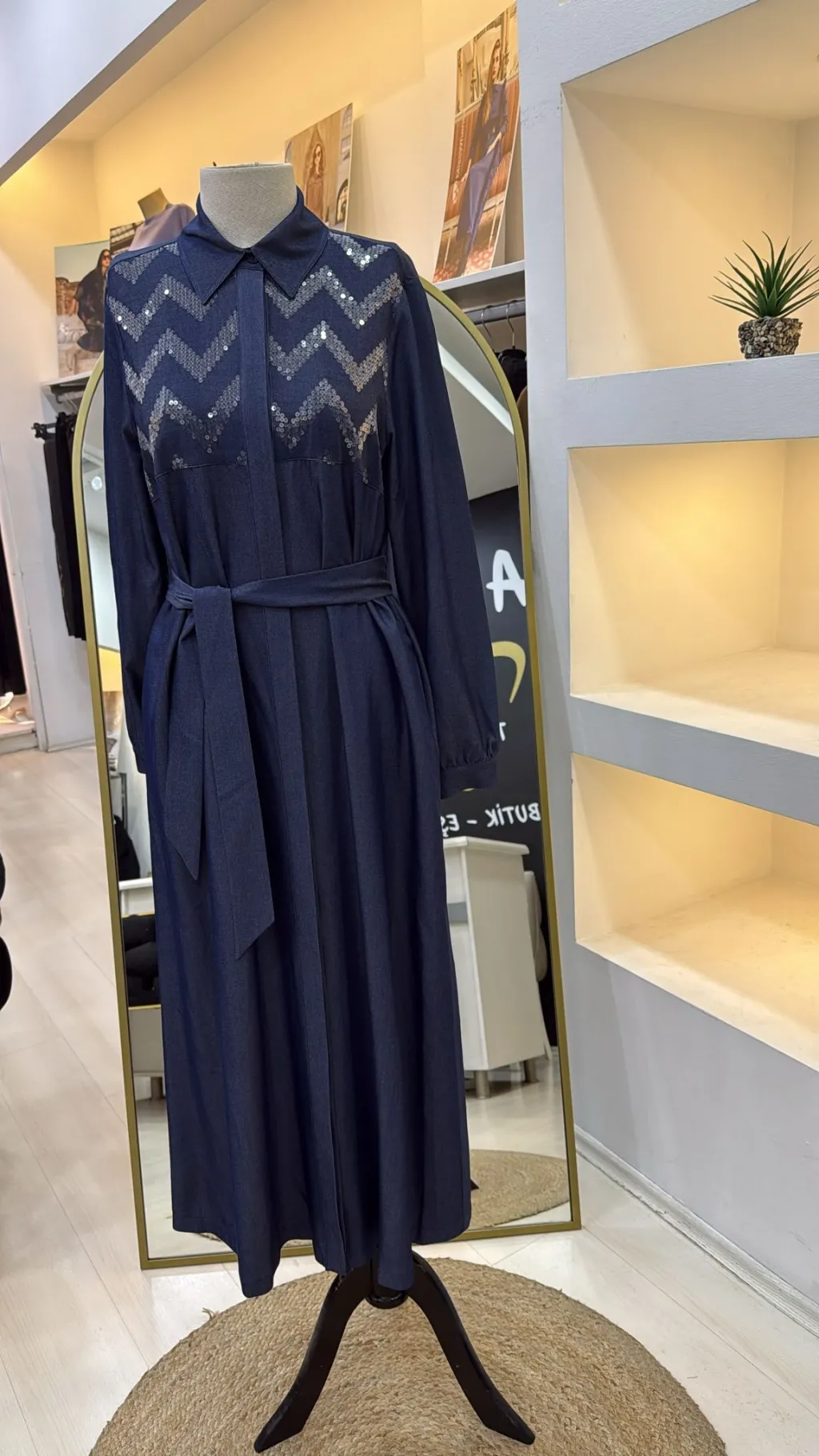 Nuss Payet Detay Kemerli Elbise - Denim 2034